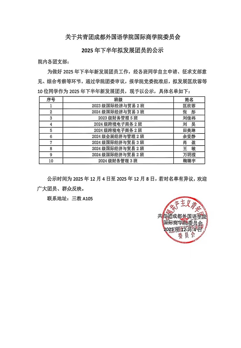 关于共青团成都外国语学院国际商学院委员会2025年下半年拟发展团员的公示