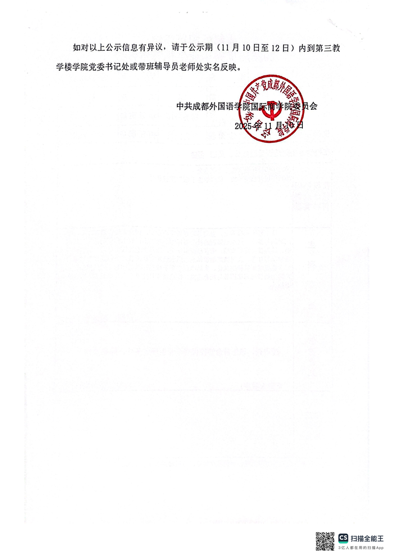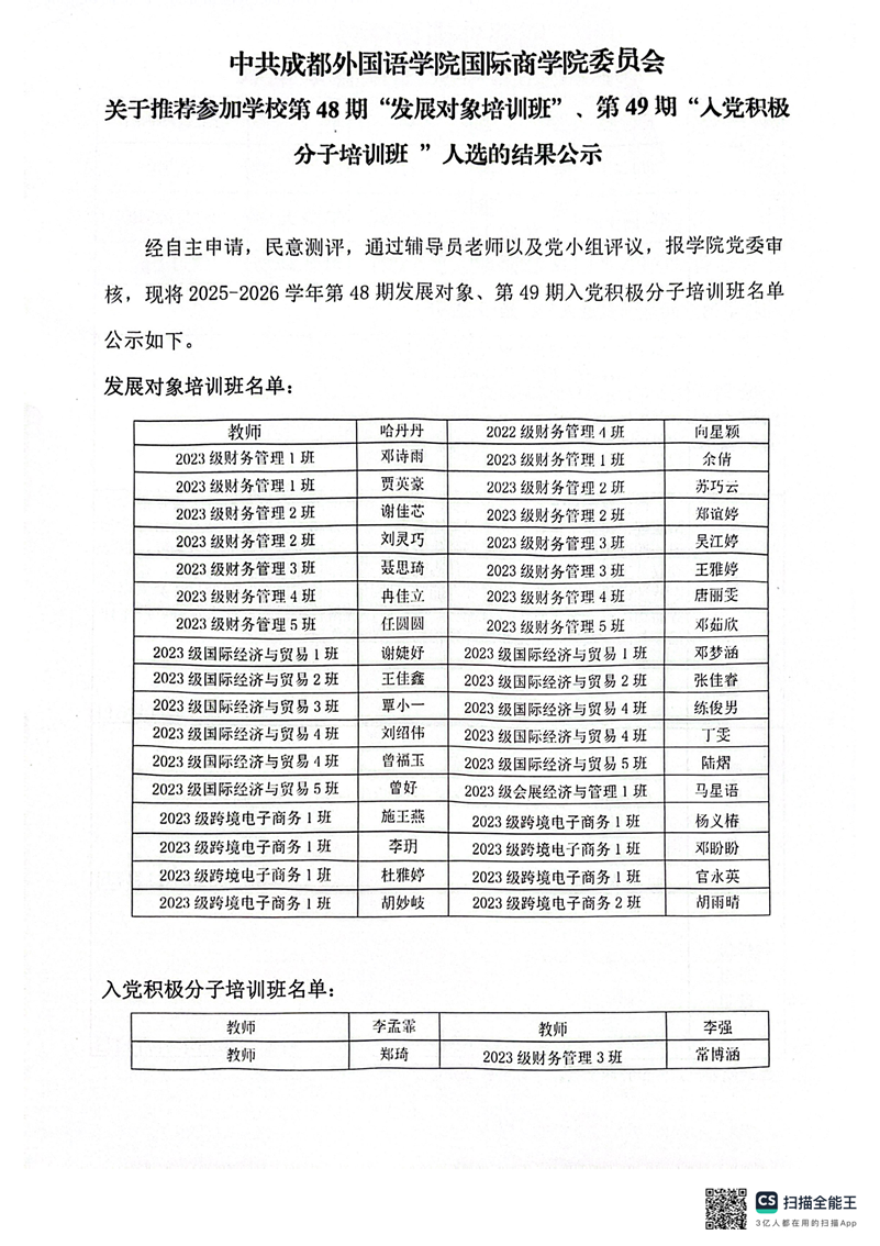 中共成都外国语学院国际商学院委员会关于推荐参加学校第48期“发展对象培训班”、第49期“入党积极分子培训班 ”人选的结果公示