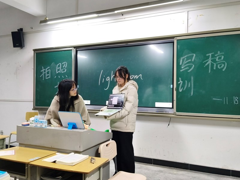 培训现场,为直观展现摄影的规范与细节,宣传部部长湛凤蓉以优秀作品案例作为切入点,开启了本次培训的摄影教学环节。她在培训中分享到,拍摄前必须熟悉活动流程,从而精准捕捉重要场景与人物。在拍摄过程中,选择正确的机位和构图方式是适应不同场景与人物的关键。她还提到,对相机的光圈、亮度、锐度、饱和度等基础参数的熟练调节,是获得高质量照片的重要保障。宣传部部长张樱瀚向干事们推荐了适应工作需求的图片后期处理软件,并现场演示操作方法。此外,部长们还对新闻稿文字编辑技巧展开讲解。最后,干事们要对稿件自查自纠,相互修改优化。培训全程,部长们讲解内容详实,精简易懂。干事们积极思考、认真记录,现场气氛热烈,培训节奏紧凑高效。