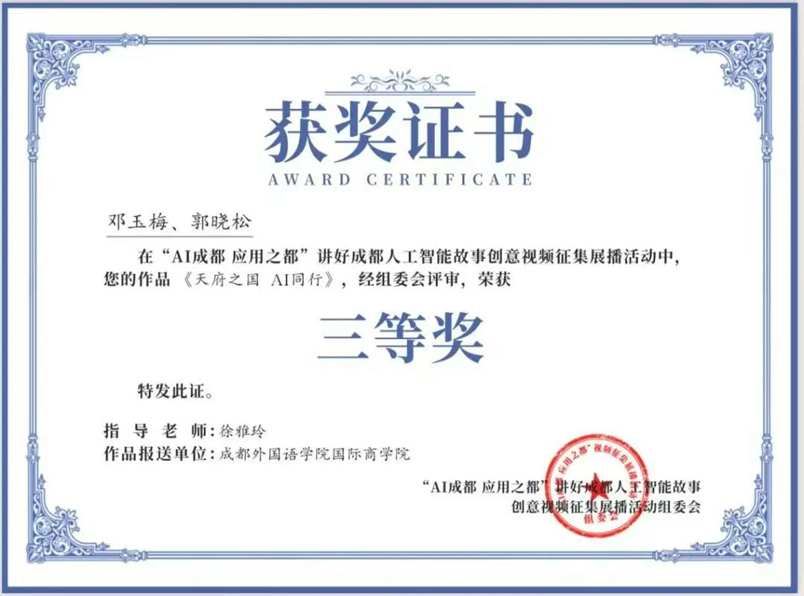 当“新文科”的跨界思维撞上AI技术的创作浪潮,来自成都外国语学院国际商学院的2023级跨境电子商务2班的邓玉梅,在我院教师徐雅玲的指导下,在“成都市首届‘AI成都 应用之都’讲好成都人工智能故事创意视频征集展播活动中”,凭借作品《天府之国 AI同行》从全国众多专业传媒机构、高校队伍中突围,斩获三等奖。