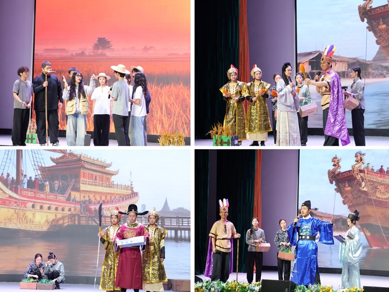 《此心安处是稻香》通过跨时空叙事,讲述了一位被外派到马达加斯加记录袁隆平团队帮助当地播种杂交水稻的女记者,意外穿越到明朝,随郑和船队远航到爪哇国帮助播种稻穗的故事,体现了我国以“真实亲诚”推动共同发展的务实外交。为完美呈现这一创意,剧组在有限的筹备期内精益求精:他们反复打磨剧本,确保外语台词地道且富有戏剧张力;同时在服装、化妆和道具上充分准备,巧妙融合古今元素。演出结尾,当演员手持金黄稻穗,向袁隆平院士庄重致敬时,现场氛围达到高潮,收获了观众的热烈掌声与广泛共鸣,呈现出完整的舞台效果。